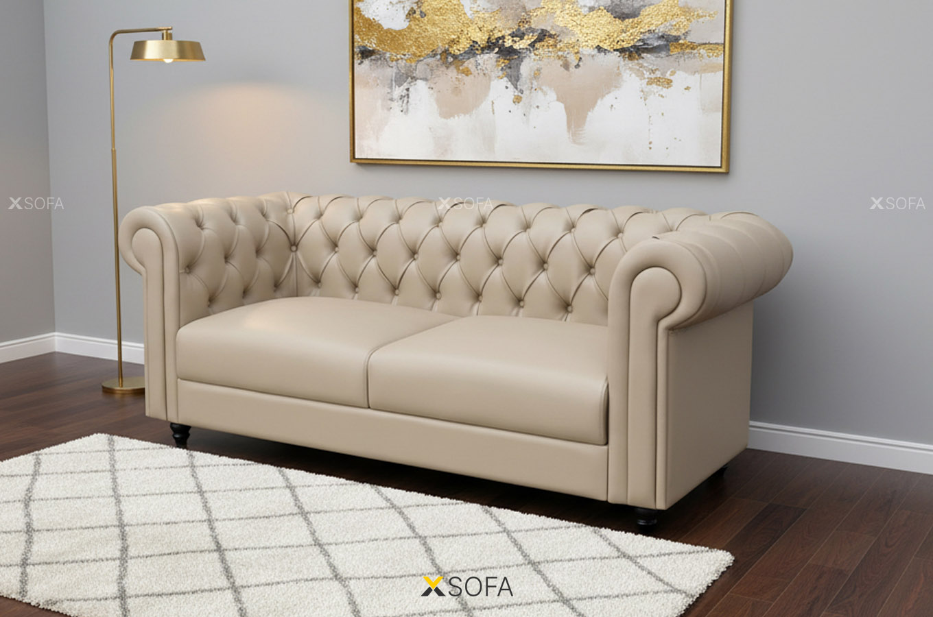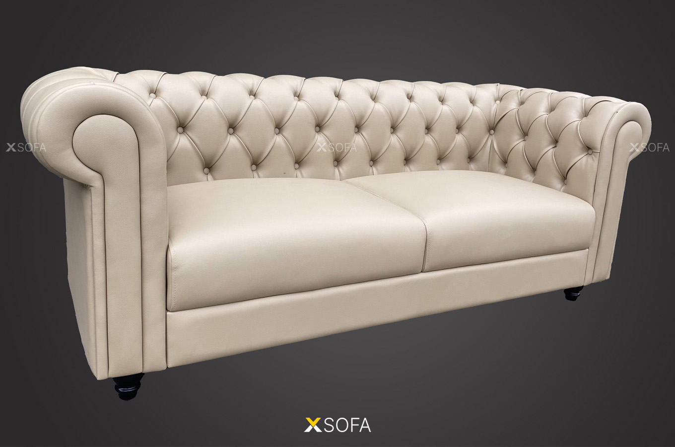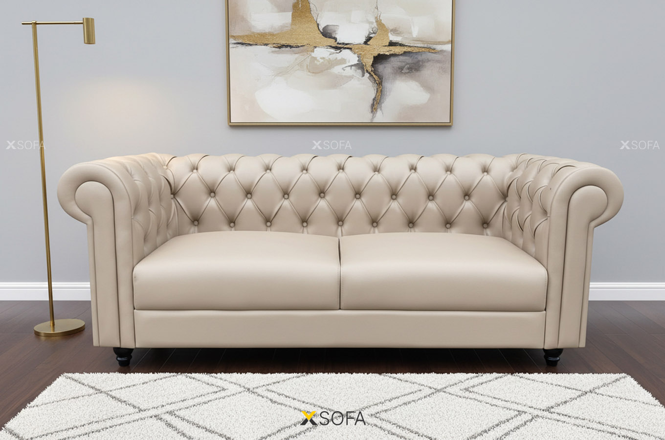 Mẫu sofa tân cổ điển bọc da cao cấp mang phong cách Chesterfield là lựa chọn lý tưởng cho những không gian đề cao sự tinh tế và sang trọng. Sản phẩm nổi bật với thiết kế nút rút thủ công tinh xảo, tay vịn bo tròn mềm mại, tạo điểm nhấn cổ điển nhưng vẫn hài hòa với nội thất hiện đại. Gam màu kem/be trang nhã giúp sofa dễ dàng phối hợp với nhiều phong cách trang trí, từ chung cư cao cấp đến biệt thự, showroom.