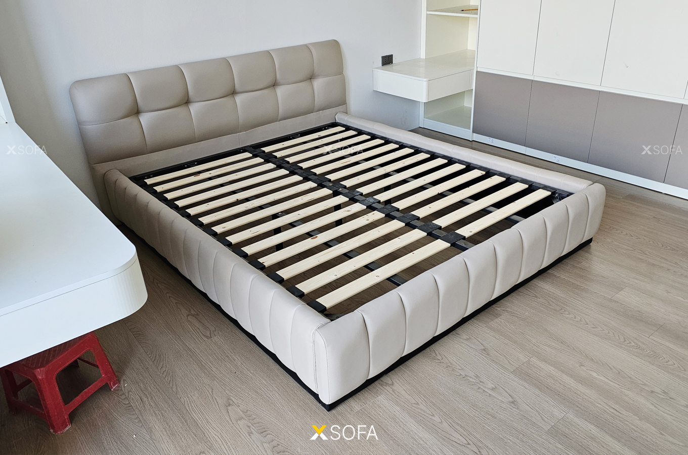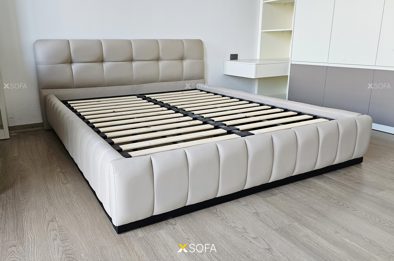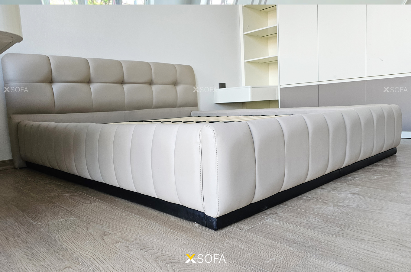 Phần đầu giường bo cong mềm mại, được chia ô vuông đều đặn tạo cảm giác cân đối, hài hòa. Đặc biệt, đường may tinh xảo và lớp da bọc nhẵn mịn giúp sản phẩm không chỉ đẹp mắt mà còn dễ dàng vệ sinh, giữ bề mặt luôn như mới sau thời gian dài sử dụng.