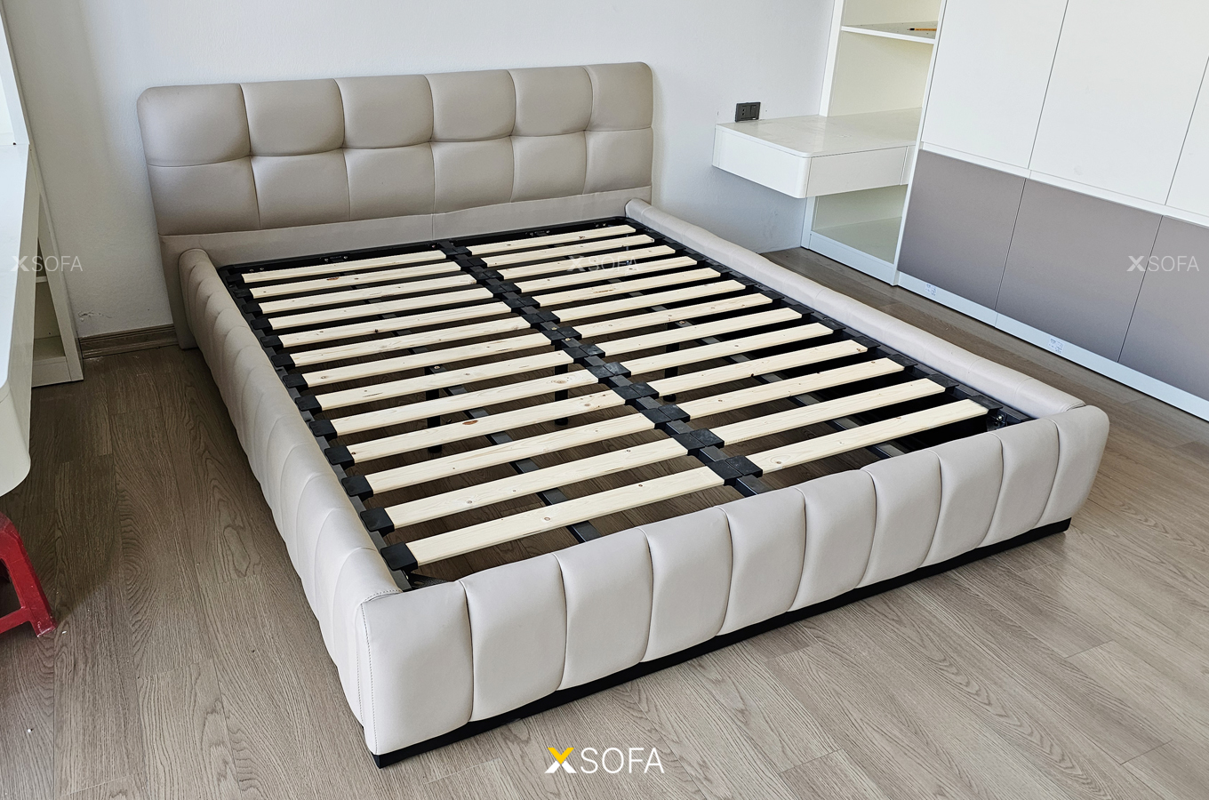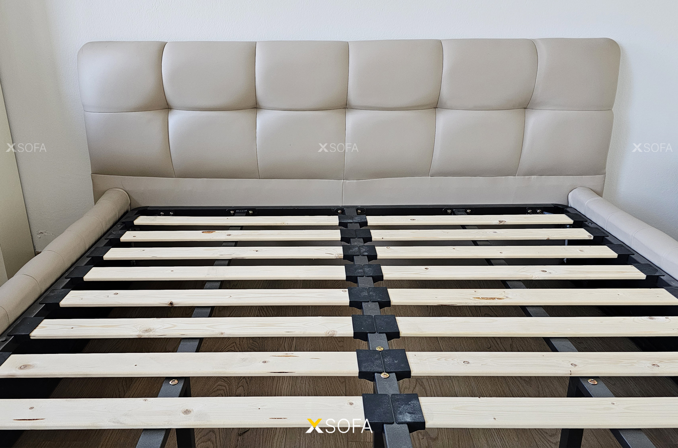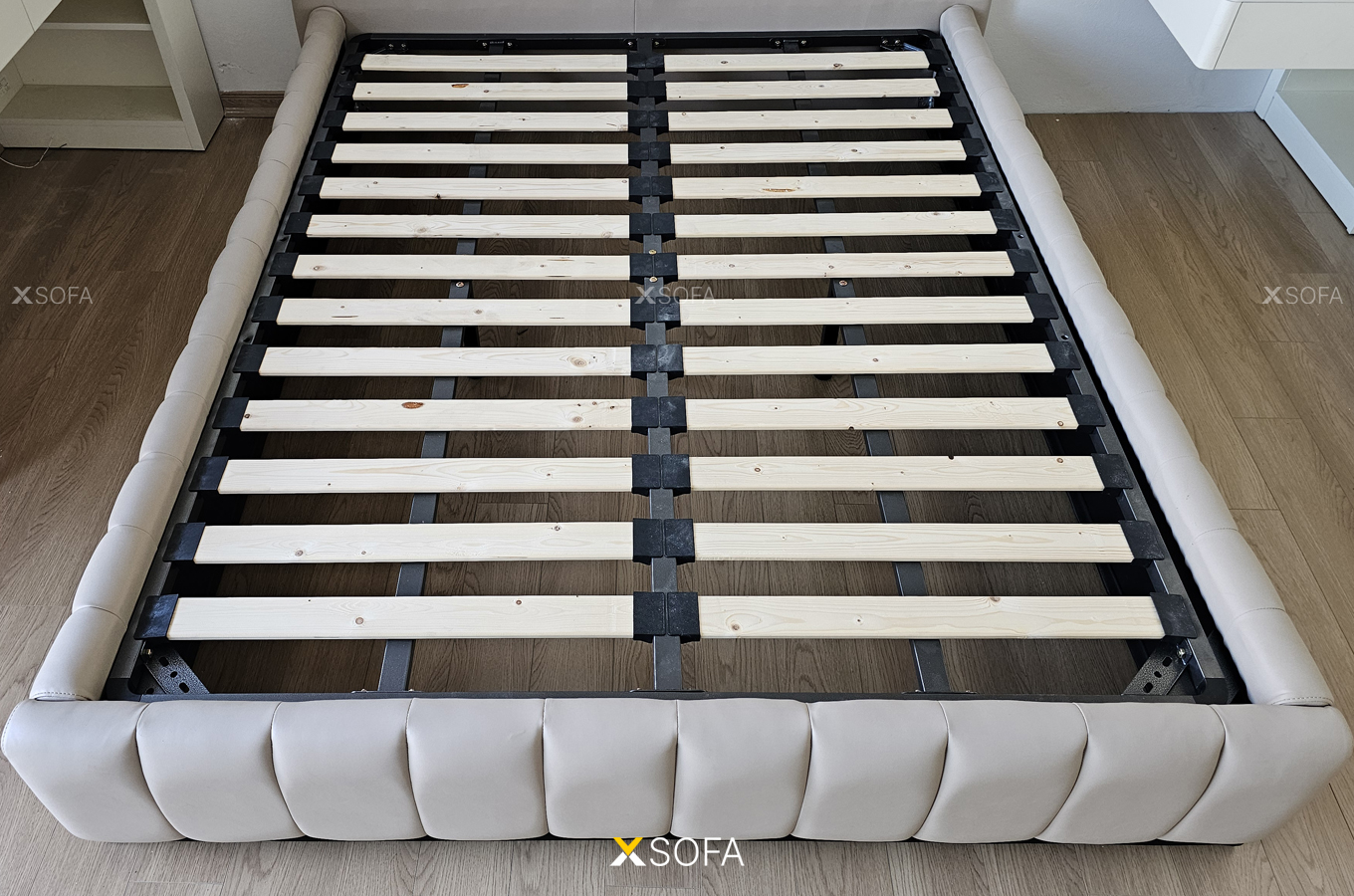 Giường sử dụng hệ khung gỗ tự nhiên bền đẹp chắc chắn, kết hợp hệ nan cong đàn hồi cao cấp giúp nâng đỡ tốt trọng lượng cơ thể, bảo vệ nệm và cột sống. Đây là dòng kết cấu đang được đánh giá cao về độ bền và khả năng hỗ trợ giấc ngủ sâu, thư giãn.