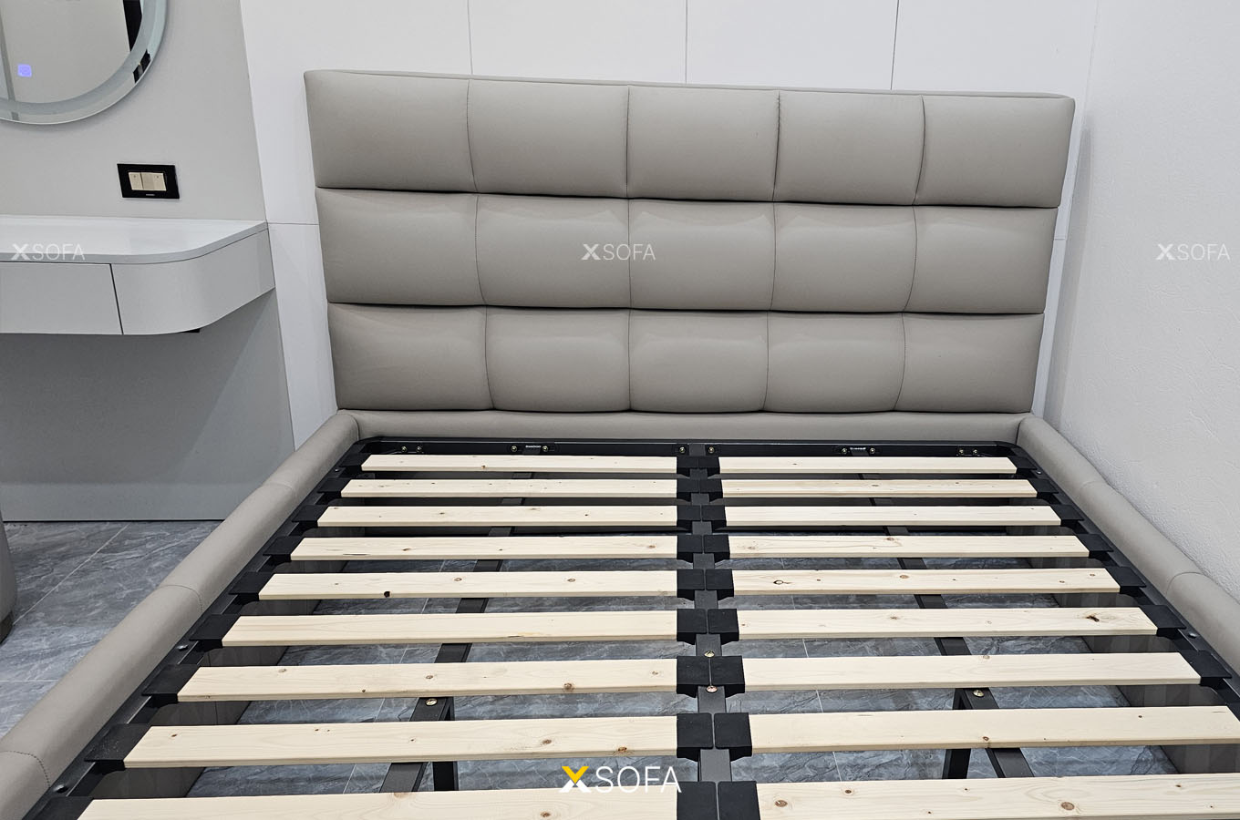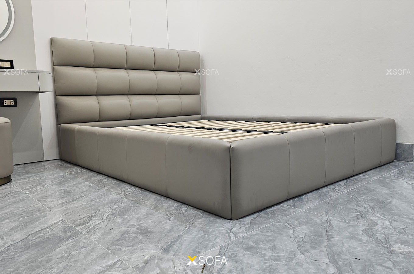 Toàn bộ khung giường được bọc da công nghiệp nhập khẩu cao cấp, chống bám bụi và dễ lau chùi. Ở phần đầu giường, Cozy 65 còn được chia múi với dường chỉ may tinh tế, tạo sự tương phản nhẹ nhàng giữa chất liệu, tăng điểm nhấn mà không làm rối thiết kế.